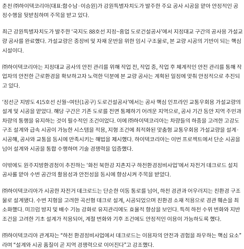 [이코노미 플러스]춘천 ㈜하이텍코리아, 지역 내 주요 공사 시공 맡아 눈길
